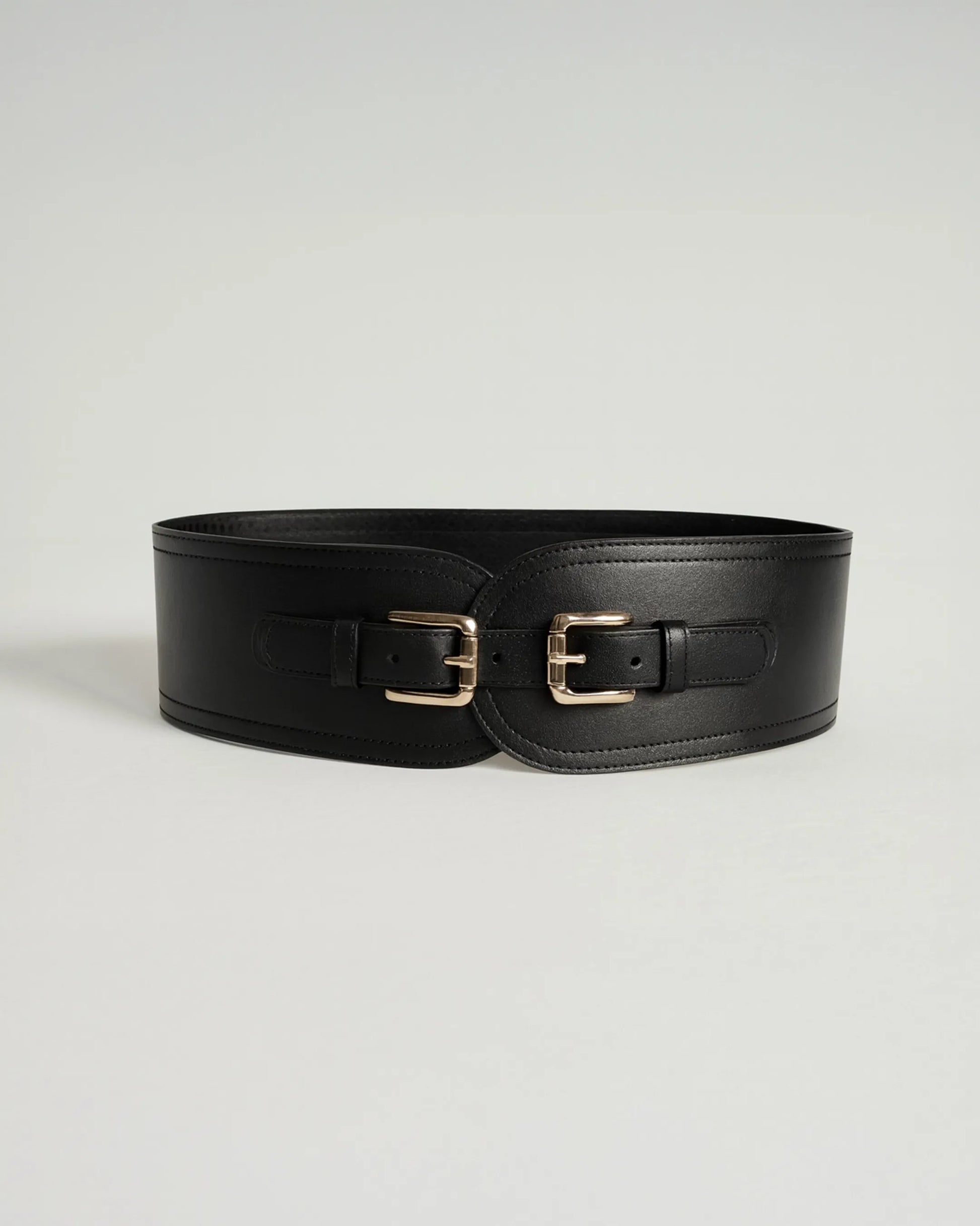 %100 hakiki deriden üretilen bu geniş kemer, çift tokalı tasarımıyla modern ve güçlü bir stil sunar. Arkası lastikli yapısıyla farklı bedenlere uyum sağlayarak hem konfor hem de şıklık sağlar. Elbiselerden ceketlere kadar birçok kombinle kullanılabilen bu kemer, bel hattını zarifçe öne çıkarır.